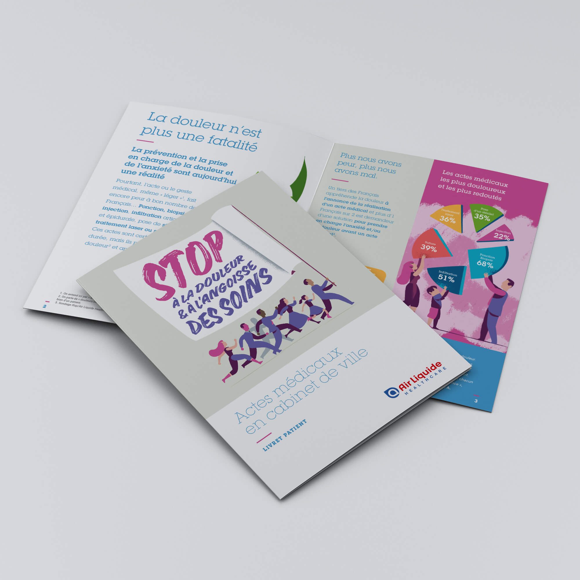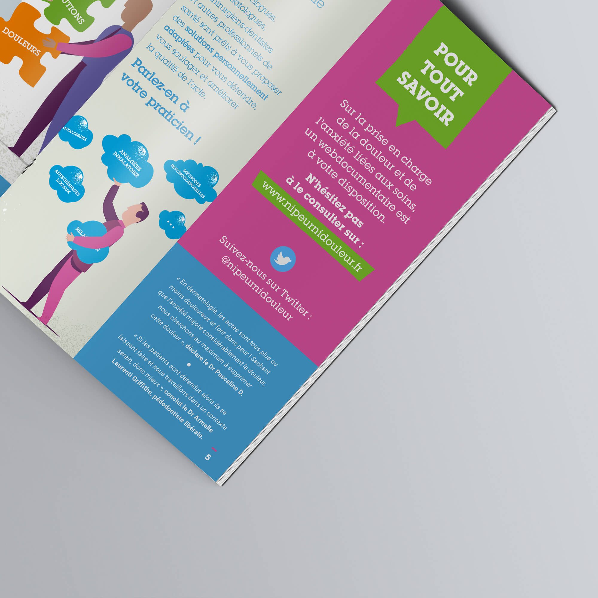 Création, illustrations et mise en page d’un livret à destination des professionnels de santé en cabinet libéral (dentiste, dermatologues, rhumatologues, podologues…). Document permettant de présenter notamment les prises en charges possibles pour éviter les angoisses et les douleurs éventuelles des patients dans le cadre de soins.