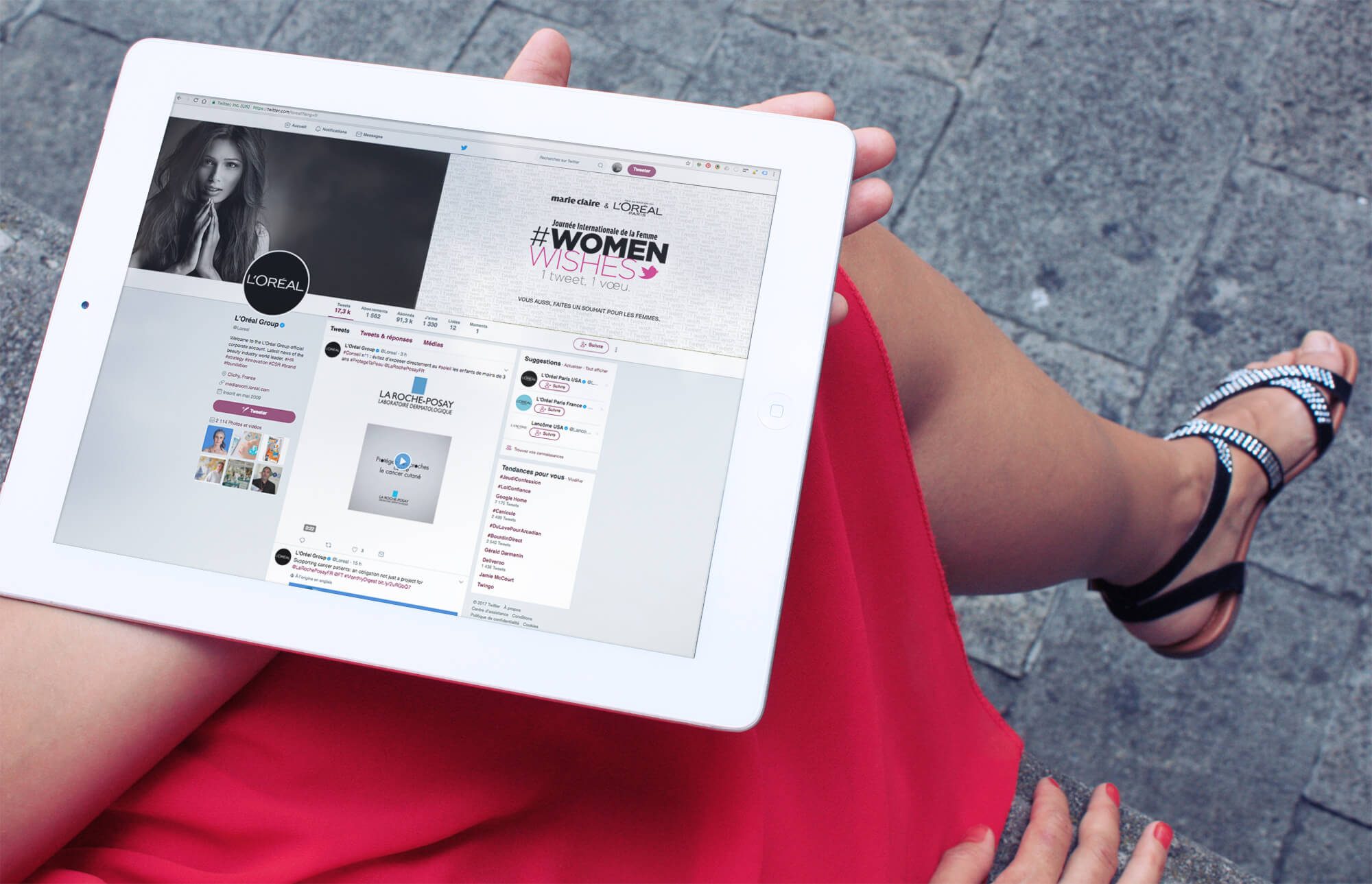 Création d’un logo « Women Wishes » et déclinaisons d’habillages pour les réseaux sociaux (Facebook, Twitter, Youtube) à l’occasion de la Journée de la Femme organisée par L’Oréal et le magazine Marie Claire.